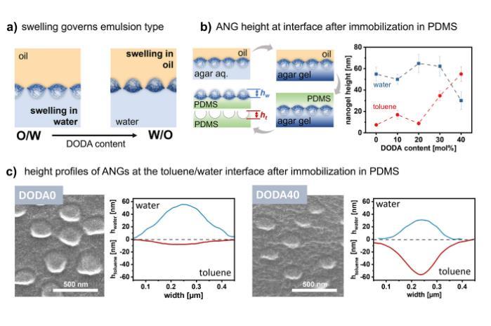 圖4的主要內(nèi)容是關(guān)于納米凝膠在甲苯/水界面的膨脹、位置和變形。作者通過實驗研究了不同親水性納米凝膠在甲苯/水界面上的行為。實驗使用了不同親水性的納米凝膠(DODA0-DODA40),通過在凝膠陷阱技術(shù)中固定納米凝膠在油/水界面上,然后通過原子力顯微鏡(AFM)測量納米凝膠在水和甲苯中的突出高度。結(jié)果表明,親水性較強的DODA0納米凝膠在水中突出較高,而在甲苯中突出較低;而親水性較弱的DODA40納米凝膠在水中突出較低,而在甲苯中突出較高。這些結(jié)果表明,納米凝膠的親水性會影響其在油/水界面的位置和膨脹行為,從而影響其乳化能力。親水性較強的納米凝膠更傾向于與水相相互作用,而親水性較弱的納米凝膠更傾向于與油相相互作用。