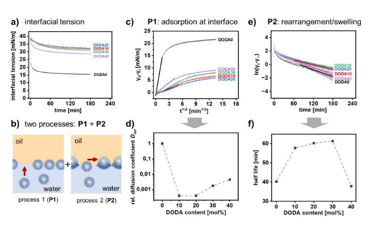 圖3展示了不同疏水性納米凝膠(ANGs)在甲苯/水界面張力(IFT)方面的研究結(jié)果。隨著ANGs的疏水性增加,甲苯/水界面張力隨時間非線性降低,但不同ANGs的降低速率不同(圖3a)。IFT的降低分為兩個階段:初始快速降低(P1)和隨后緩慢松弛到平衡狀態(tài)(P2)(圖3b)。通過分析P1階段,可以得到描述ANGs界面吸附速率的擴散系數(shù)D(圖3c)。不同ANGs的相對擴散系數(shù)Drel(相對于DODA0)與ANGs的DODA含量相關(guān):親水的DODA0和疏水的DODA40顯示出最快的界面吸附速率(圖3d)。通過分析P2階段,可以得到描述ANGs重新排列速率的半衰期(圖3e)。半衰期與ANGs的DODA含量相關(guān):親水的DODA0和疏水的DODA40顯示出最快的重新排列速率(圖3f)。