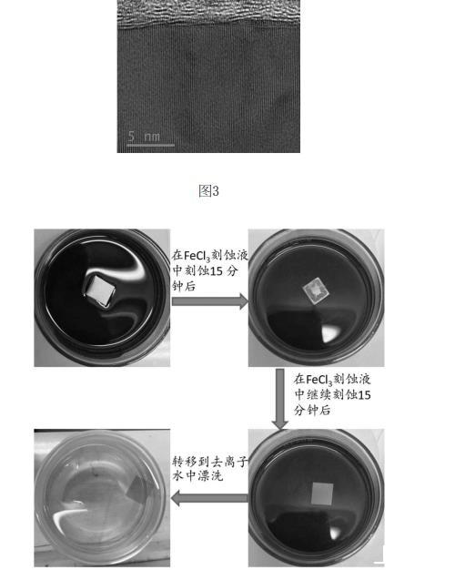 具體的,對(duì)于多層石墨烯/初始基底復(fù)合結(jié)構(gòu)以初始基底為銅舉例說明,實(shí)物如圖2(a)、圖2(b)所示,其截面如圖所3示;蝕刻液選用FeCl3溶液。為便于本領(lǐng)域技術(shù)人員理解,以小尺寸多層石墨烯/初始基底復(fù)合結(jié)構(gòu)的蝕刻過程進(jìn)行展示,蝕刻過程如圖4所示,從圖4可看出,得到的多層石墨烯薄膜可自懸浮于液面上。