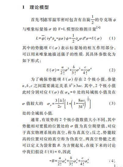 本文具體采用的模型是具有夸克禁閉性質(zhì)的Friedberg-Lee模型(F-L Model)。F-L模型最初用于描述低能時(shí)強(qiáng)子的行為,將強(qiáng)子看做真空中的袋狀孤子解,為QCD理論中的禁閉行為提供了非常直觀的物理解釋。不僅如此,該模型也被擴(kuò)展至有限溫度密度下夸克物質(zhì)的退禁閉相變的研究,提供了研究夸克強(qiáng)子相變性質(zhì)的有利手段。但是該模型只能給出有限溫度密度下夸克物質(zhì)一級(jí)相變的結(jié)果,無(wú)法討論平滑過(guò)渡(Crossover)相變和相臨界截點(diǎn)相關(guān)的物理問(wèn)題,具有一定局限性。不過(guò)本文主要研究夸克強(qiáng)子一級(jí)相變下氣泡或液滴的動(dòng)力學(xué)問(wèn)題,F(xiàn)-L模型是比較合適的模型。