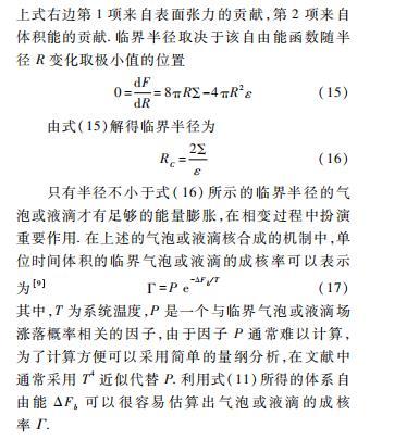 若溫度升高,則情況相反。借助液滴核合成唯象理論,由量子漲落或熱漲落效應(yīng)將會(huì)使得偽真空中均勻地產(chǎn)生一系列大小不一的代表真真空的氣泡或者液滴,體系向溫度低于臨界溫度的方向演化時(shí)產(chǎn)生氣泡,反之體系向溫度高于臨界溫度的方向演化時(shí)產(chǎn)生液滴。由于偽真空比真真空體積自由能密度高,兩真空存在能量差ε,因此在相變發(fā)生時(shí)該能量差會(huì)以相變潛熱的方式釋放出來(lái),作為支撐氣泡或液滴膨脹的體積能,體積能的大小正比于-R3.同時(shí),將兩真空分隔開(kāi)的界面具有抑制氣泡或液滴膨脹的表面張力Σ,表面張力正比于+R2.很明顯,在氣泡或液滴的半徑較小時(shí)+R2的效應(yīng)較明顯,而半徑較大