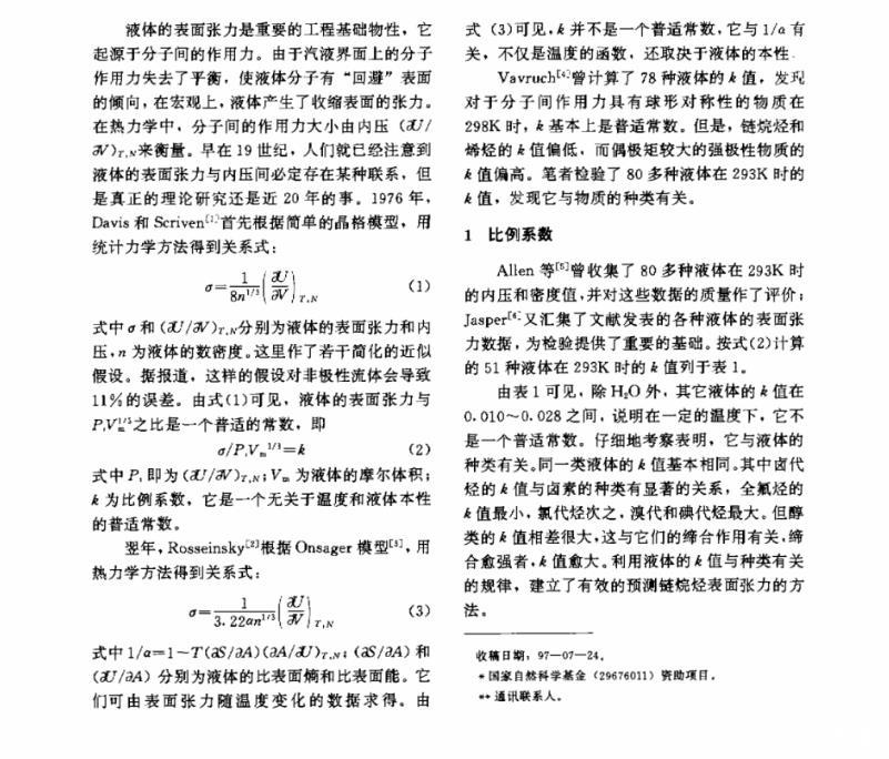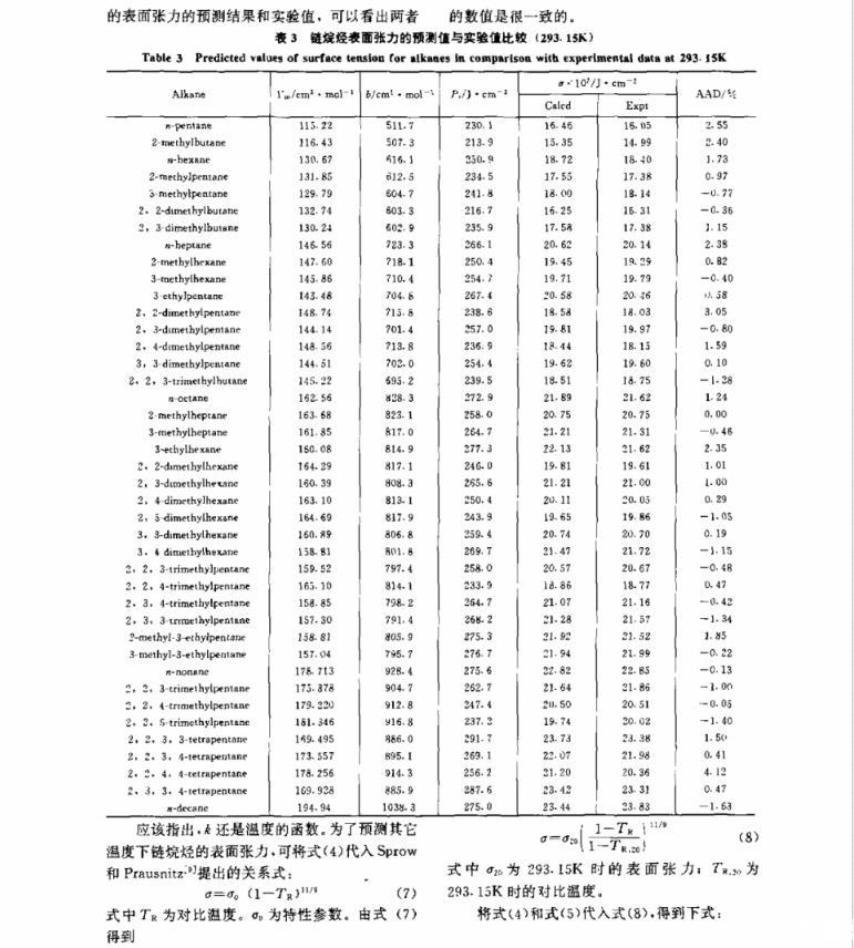 對(duì)Davis和Rosseinsky提出的關(guān)系檢驗(yàn)表明,液體的表面張力σ與P1Vm1/3之比不僅取決于溫度,還與液體的種類有關(guān),據(jù)此,建立了一個(gè)能由鏈烷烴的分子結(jié)構(gòu)準(zhǔn)確預(yù)測(cè)其表面張力的方法。