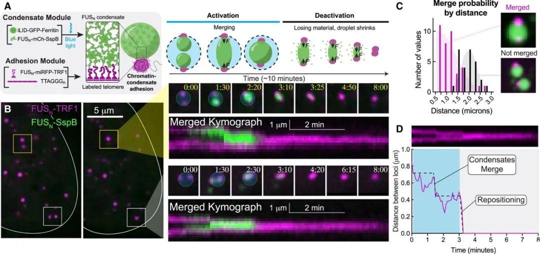通過局部藍(lán)光激活,凝聚體可以在標(biāo)記的位點(diǎn)上被誘導(dǎo)形成。在持續(xù)光激活下,錨定到兩個(gè)相鄰染色質(zhì)位點(diǎn)的凝聚體會生長并融合為一個(gè),并與目標(biāo)位點(diǎn)保持關(guān)聯(lián)。在去激活后,凝聚體收縮產(chǎn)生拉力,導(dǎo)致這些位點(diǎn)重新定位(圖1A)。這種方法能使端粒成功地在多個(gè)微米的核空間內(nèi)重新定位。然而,如果位點(diǎn)之間的距離超過2