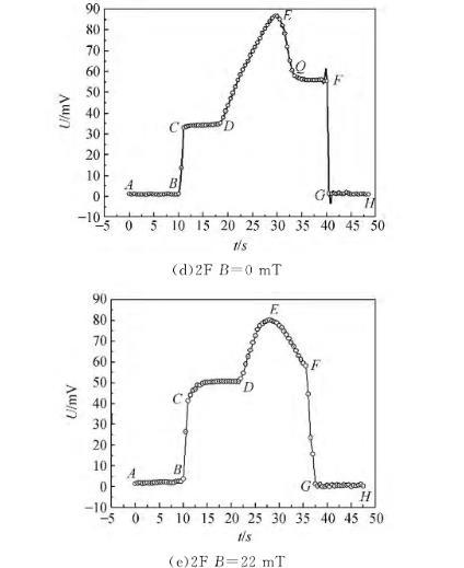 使用拉脫法測量了磁性液體的磁表面張力,無外加磁場作用時,磁性液體的表面張力小于其載液的表面張力,磁性液體液膜拉得更長,液膜收縮的趨勢比白油更明顯,這主要是因為磁性液體中加入的表面活性劑降低了其表面張力。由液膜拉脫過程電壓變化曲線可觀察到:不同條件下磁性液體的電壓變化情況不同,無外加磁場作用時2F號磁性液體在EF階段存在轉(zhuǎn)折點(diǎn)Q,越過轉(zhuǎn)折點(diǎn),QF階段電壓變化較平緩,且表面張力越小;而7#白油和1F磁性液體并未出現(xiàn)此現(xiàn)象,這主要是因為7#白油和1F磁性液體表面張力較大,2F號磁性液體由于表面張力較小,其液體分子與分子之間的作用力較弱,宏觀表現(xiàn)為拉脫的液膜更長,液膜在空氣中會存在一段時間。有外加磁場作用時,2F號磁性液體在FG階段并未出現(xiàn)電壓變化平緩的中間過程,但FG階段出現(xiàn)了另一些數(shù)據(jù)點(diǎn),液膜破裂的時間大于無外加磁場作用時的時間,主要是由于外加磁場增強(qiáng)了磁性顆粒之間的相互作用,分子和分子之間的磁吸引力增強(qiáng),導(dǎo)致液膜逐步破裂。