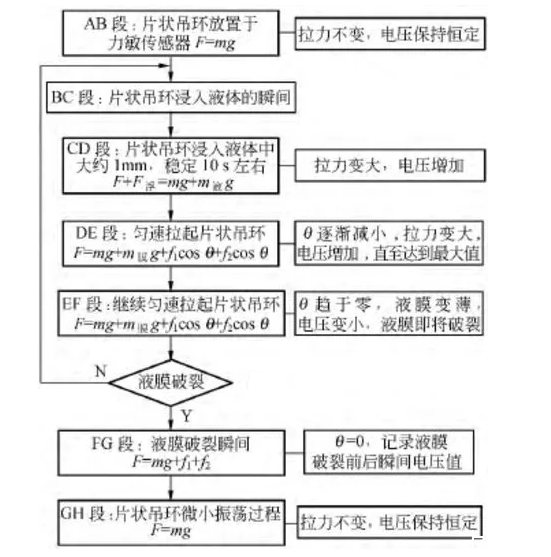 根據(jù)受力情況將圖4的液膜拉脫過程電壓變化曲線分為6個階段,圖5為液膜拉脫過程方框圖,不同階段片狀吊環(huán)的受力情況不同,電壓變化值也不同,在液膜破裂前后瞬間,忽略液膜的重力,表面張力與重力方向完全一致,此時F=mg+f1+f2,可得到液體的表面張力。由圖4發(fā)現(xiàn),不同液體在EF階段的電壓變化情況不同,無外加磁場作用時2F號磁性液體在EF階段存在轉(zhuǎn)折點(diǎn)Q,越過轉(zhuǎn)折點(diǎn),QF階段電壓變化較平緩,且表面張力越小;而7#白油和1F磁性液體并未出現(xiàn)此現(xiàn)象。出現(xiàn)該現(xiàn)象的原因是7#白油和1F磁性液體表面張力較大,當(dāng)液膜被拉脫到一定程度時,很快破裂;而2F號磁性液體由于表面張力較小,液體分子與分子之間的作用力減弱,宏觀表現(xiàn)為拉脫的液膜更長,液膜在空氣中會存在一段時間,此時液膜質(zhì)量很小,可忽略不計,電壓變化較平緩。有外加磁場作用時,1F和2F號磁性液體在FG階段并未出現(xiàn)電壓變化平緩的中間過程,但有外加磁場作用于磁性液體時,F(xiàn)G階段出現(xiàn)了一些數(shù)據(jù)點(diǎn),液膜破裂的時間大于無外加磁場作用時的時間,主要是由于外加磁場增強(qiáng)了磁性顆粒之間的相互作用,分子和分子之間的磁吸引力增強(qiáng),導(dǎo)致液膜逐步破裂。