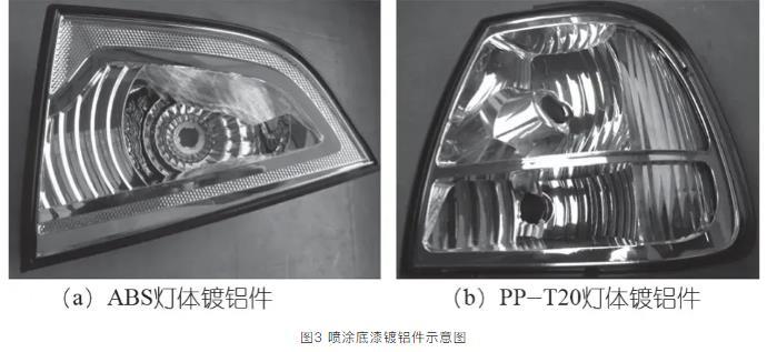 PP-T20和ABS表面張力都是較低,與鍍鋁層結(jié)合力較差,通過噴涂底漆獲得較好地表面張力,提高附著力。如圖3(a)所示為ABS材料加工汽車后霧燈體,ABS表面張力為34~38 mN/m,ABS是三元共聚物,內(nèi)在的成分比例有些差異,表面張力是個(gè)范圍值,可噴涂底漆(涂料低聚物環(huán)氧丙烯酸酯)改善ABS表面張力。