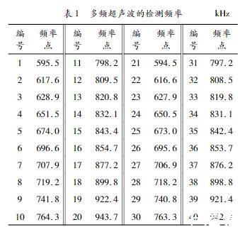 該系統(tǒng)由3部分組成:超聲波傳感器、多頻超聲波控制單元和數(shù)據(jù)處理單元。多頻超聲波控制單元包括產(chǎn)生超聲波信號(hào)的超聲波發(fā)射模塊和用于接收超聲波信號(hào)的超聲波接收模塊,其中超聲波傳感器的輸入端與超聲波發(fā)射模塊連接,超聲波傳感器的輸出端與超聲波接收模塊連接。與多頻控制單元的信號(hào)輸出口相連接的超聲波發(fā)射器將電信號(hào)經(jīng)過(guò)延遲線中的超聲換能器轉(zhuǎn)換為聲波信號(hào),并進(jìn)入測(cè)量室中的待測(cè)介質(zhì)變壓器油中進(jìn)行傳播。超聲波發(fā)射模塊每20s產(chǎn)生40個(gè)頻率范圍為590——1000kHz的超聲波信號(hào),40個(gè)頻率點(diǎn)如表1所示。