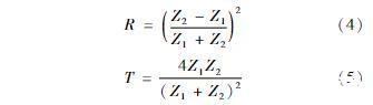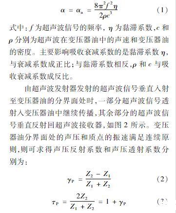 由超聲波發(fā)射器發(fā)射的超聲波信號(hào)垂直入射至變壓器油的分界面處時(shí),一部分超聲波信號(hào)透射入變壓器油中繼續(xù)傳播,其余部分的超聲波信號(hào)垂直反射回超聲波接收器,如圖2所示。變壓器油分界面處的聲壓和質(zhì)點(diǎn)的振速滿足連續(xù)原則,則可求得聲壓反射系數(shù)和聲壓透射系數(shù)分別為: