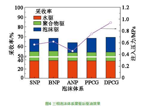 三相泡沫體系聚驅(qū)后驅(qū)油效果見圖6。由圖6可知,3支并聯(lián)巖心水驅(qū)采收率約為38%,聚驅(qū)采收率約為17%,聚驅(qū)后DPCG三相泡沫體系注入壓力和驅(qū)油效果最好,聚驅(qū)后采收率超過15%;PPCG體系次之,采收率超過14%。聚驅(qū)后SNP或BNP三相泡沫體系注入壓力和驅(qū)油效果相對較差,聚驅(qū)后采收率約為13%。聚驅(qū)后ANP三相泡沫體系注入壓力和驅(qū)油效果最差,但聚驅(qū)后采收率仍超過10%。