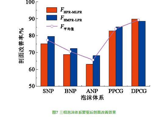 三相泡沫體系聚驅(qū)后剖面改善效果見圖7。由圖7可知,不同三相泡沫體系在高滲與中低滲層的剖面改善率(FHPR-MLPR)高于63%,在高、中滲與低滲層的剖面改善率(FHMPR-LPR)高于68%,平均改善率大于65%。其中DPCG或PPCG三相泡沫體系的FHPR-MLPR和FHMPR-LPR最好(超82%),DPCG三相泡沫體系的FHMPR-LPR低于FHPR-MLPR。SNP、BNP或ANP三相泡沫體系的FHPR-MLPR和FHMPR-LPR相對較差,但其FHMPR-LPR好于FHPR-MLPR。