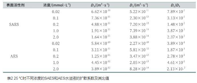 表2 25℃時不同濃度的SAES和AES水溶液的擴(kuò)散系數(shù)及其比值