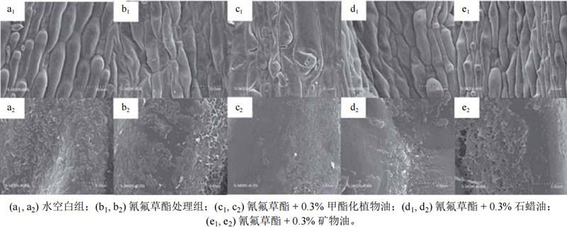 通過掃描電鏡觀察稗草葉片結(jié)構(gòu)變化探究了油類助劑對(duì)氰氟草酯防除稗草的增效作用。作者分別對(duì)比了純水、氰氟草酯處理和添加油類助劑的氰氟草酯處理后的稗草葉片結(jié)構(gòu),發(fā)現(xiàn)水對(duì)稗草葉表面的蠟質(zhì)層和表皮細(xì)胞沒有任何影響(圖1a1,a2),氰氟草酯使表皮細(xì)胞略有萎縮(圖1b1),溶解了少量的表皮蠟質(zhì)層(圖1b2),而添加油類助劑后均發(fā)生表皮細(xì)胞變窄萎縮和蠟質(zhì)層溶解的現(xiàn)象(圖1c1-e2)。其中,石蠟油和礦物油能使表皮細(xì)胞變窄變小,水分減少(圖1d1,e1),溶解大約30%的表皮蠟質(zhì)(圖1d2,e2)。甲酯化植物油(MSO)能較大程度地使表皮細(xì)胞萎縮(圖1c1),溶解超過50%的蠟質(zhì)層(圖1c2)。正是因?yàn)镸SO(體積分?jǐn)?shù)0.5%)溶解了大量稗草葉片的表皮蠟質(zhì)層,嚴(yán)重破壞了葉片的角質(zhì)層,從而極大地增強(qiáng)了稗草葉片對(duì)氰氟草酯的滲透和吸收能力,使其對(duì)氰氟草酯防除稗草的防效提高了78.7%。