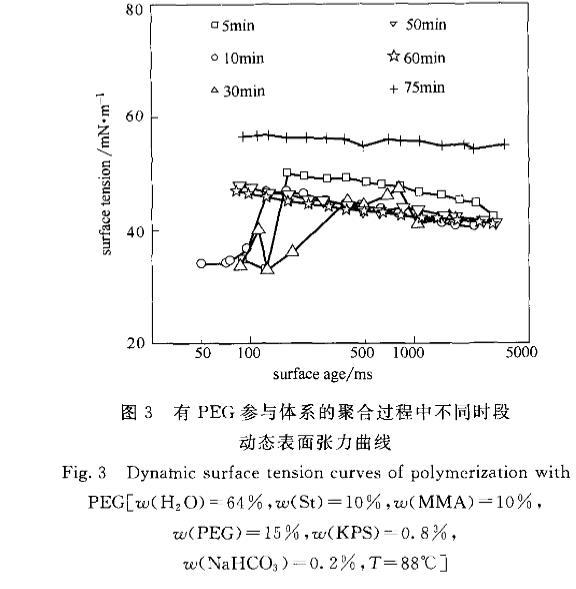 由于PEG的存在,使St/MMA在水相中經(jīng)歷了不一樣的聚合過程,PEG會使體系的反應(yīng)速率變慢,當反應(yīng)到50min時轉(zhuǎn)化率只有49,而無PEG參與的體系在30min時聚合已接近終點,轉(zhuǎn)化率達到98以上。St/MMA和引發(fā)劑形成的聚合物在PEG的作用下,形成了一種具有更強表面活性的聚合物,其表面活性水平高于PEG以及無PEG參與的聚合體系的聚合物,但弱于混合單體及齊聚物。這種較強表面活性的聚合物在轉(zhuǎn)化率只有5的時候就已經(jīng)存在,是聚合物進入粒子堆形成小粒子且穩(wěn)定粒子的動力,并最終使粒子帶有足夠脫離粒子堆的表面電荷。