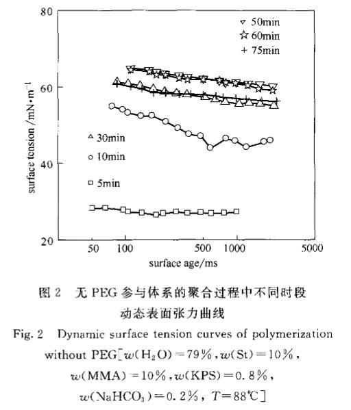 2.2聚合時間對動態(tài)表面張力變化趨勢的影響經(jīng)引發(fā),水相中溶解的單體聚合成鏈,聚合體系的組分也隨之發(fā)生變化。體系在水相中含有了自由基齊聚物,以及由齊聚物聚集形成的基本粒子或膠束。這些新產(chǎn)生的物質(zhì)對DST曲線有很明顯的影響,加上PEG與聚合物鏈的相互作用,則使DST曲線有更多的變化。為了能明確地分析PEG在聚合過程中的作用,進行了有PEG和無PEG參與的聚合體系各時間段動態(tài)表面張力實驗比較。圖2和圖3分別為St/MMA在無PEG的水中和有PEG的水溶液中DST隨聚合時間的變化趨勢。
