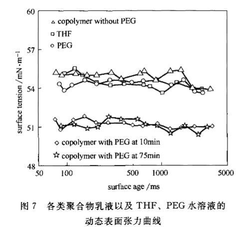 圖7各類聚合物乳液以及THF、PEG水溶液的動態(tài)表面張力曲線