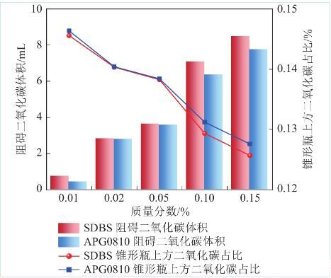 圖12為注入二氧化碳的氣相色譜檢測結果,計算出表面活性劑泡沫對二氧化碳的緩釋作用結果如圖12柱狀圖所示。相同質量分數(shù)下,SDBS溶液對二氧化碳的緩釋效應優(yōu)于APG0810。然而兩種表面活性劑對二氧化碳緩釋效應均不顯著,SDBS表面活性劑溶液在質量分數(shù)最大時10 min內只控制了8.46 mL二氧化碳氣體,APG0810只控制了7.74 mL二氧化碳氣體。