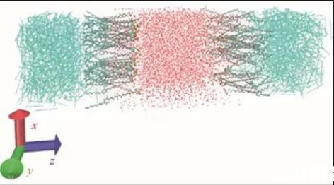 在進(jìn)行分子動(dòng)力學(xué)模擬之前構(gòu)建出合理的力場(chǎng)是極為重要的工作。本文通過Autom-ated Topology Builder(ATB)and repository生成的GROMOS系列力場(chǎng)參數(shù),利用現(xiàn)有的數(shù)據(jù)庫(kù)以及量子化學(xué)進(jìn)行計(jì)算,同時(shí)它可以充分考慮到分子中的對(duì)稱結(jié)構(gòu),使其反映出的分子性質(zhì)及參數(shù)更為精確。但ATB只能處理原子數(shù)小于40的分子,對(duì)于分子數(shù)大于40的分子結(jié)構(gòu)需進(jìn)行拆分。在獲取準(zhǔn)確的電荷及鍵參數(shù)之后利用packmol程序定向排列分子將其堆砌成立方體結(jié)構(gòu)。此外,本文選取的油-水界面需使表面活性劑平均分布在水相兩側(cè),親水基靠近水相,疏水基靠向油相。圖2為初始狀態(tài)下體系截圖,其中中間紅色部分為水分子,左右兩側(cè)藍(lán)色部分為癸烷分子,油水中間即OPES分子。