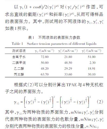 根據(jù)Owens-Wendt公式(1)來計(jì)算TPAE、Talc、CaSiO3、CaCO3、WI的表面張力γ。