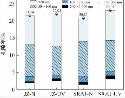 2)強紫外線輻射環(huán)境對不同組分水泥石干縮變形的影響不同。與基準組相比,SRA試驗組的干縮值極大程度降低。然而,SRA促進了水泥石的水分散失,增大了水泥石體系中大于200 nm的大孔比例,由此帶來的結(jié)構(gòu)劣化問題不可忽視。