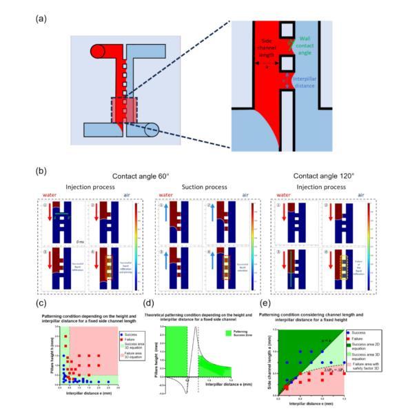 圖2展示了用于模擬液體填充和圖案化條件的數(shù)值模擬和實(shí)驗(yàn)驗(yàn)證,進(jìn)一步分析了在微流體平臺(tái)中實(shí)現(xiàn)毛細(xì)釘扎過程的成功條件。圖2a展示了與圖案化成功條件相關(guān)的物理參數(shù),包括柱子的高度、間距和側(cè)通道的長度。通過這些參數(shù)的控制,可以預(yù)測(cè)液體在微柱之間的保留情況。圖2b展示了液體填充過程的數(shù)值模擬,包括在不同接觸角(例如60°和120°)條件下的液體流動(dòng)和釘扎效果。模擬結(jié)果顯示了如何通過改變接觸角和壓力控制液體在微柱之間的流動(dòng)和停留。圖2b的模擬驗(yàn)證了在較大接觸角下液體被釘扎在微柱邊緣的效果。圖2c至2e總結(jié)了不同微柱高度、間距和側(cè)通道長度對(duì)液體保留過程的影響,通過這些參數(shù)優(yōu)化可實(shí)現(xiàn)液體在微柱之間的穩(wěn)定釘扎,適用于后續(xù)的細(xì)胞培養(yǎng)實(shí)驗(yàn)。