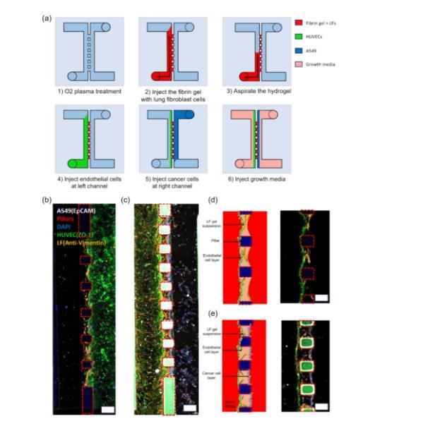 圖3通過細(xì)胞加載流程示意圖和熒光圖像,展示了微流體平臺(tái)在再現(xiàn)肺泡三維微環(huán)境方面的有效性。圖3a展示了細(xì)胞加載的步驟,包括在水凝膠薄膜兩側(cè)加入不同類型的細(xì)胞,以創(chuàng)建多層細(xì)胞結(jié)構(gòu)。圖3b和3c展示了微流體平臺(tái)上與內(nèi)皮細(xì)胞和肺成纖維細(xì)胞的共培養(yǎng)熒光圖像。水凝膠薄膜中含有橙色染色的成纖維細(xì)胞,水凝膠膜側(cè)面綠色層表示生長的內(nèi)皮細(xì)胞層。這種結(jié)構(gòu)模擬了肺部的基質(zhì)和內(nèi)皮層,為后續(xù)肺部疾病研究提供了生理相關(guān)的模型。圖3d和3e分別展示了細(xì)胞配置的示意圖和最大投影的共聚焦顯微圖像。在這些圖中可以看到肺成纖維細(xì)胞(橙色)和內(nèi)皮細(xì)胞(綠色)在水凝膠薄膜的不同層次的分布情況,形成了一個(gè)三維的細(xì)胞共培養(yǎng)環(huán)境。圖像還顯示,細(xì)胞在培養(yǎng)過程中保持了較高的活力,并成功地在水凝膠薄膜周圍形成了均勻的細(xì)胞層。
