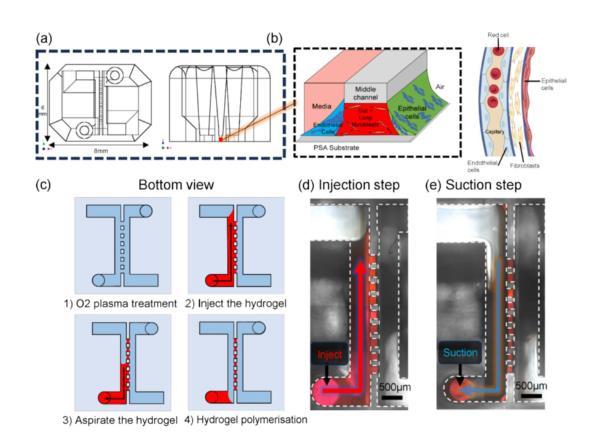 圖1展示了一個(gè)基于表面張力的開放式微流體平臺(tái)的結(jié)構(gòu)和液體圖案化過程,用于再現(xiàn)肺部的三維細(xì)胞微環(huán)境。圖1a展示了微流體平臺(tái)的頂視圖和側(cè)視圖。平臺(tái)的中心區(qū)域包含微柱陣列,用于形成薄的水凝膠膜,兩側(cè)是包含不同細(xì)胞懸浮液的流體通道。圖1b展示了水凝膠和不同細(xì)胞層的位置安排,模擬肺部細(xì)胞環(huán)境的氣-液界面結(jié)構(gòu)。圖1c到圖1e展示了圖案化過程的兩個(gè)關(guān)鍵步驟——液體注入和保持。首先,水凝膠液體通過微柱流動(dòng);當(dāng)液體達(dá)到通道的擴(kuò)展區(qū)域時(shí),使用吸取器將多余液體移除,剩余部分被保持在微柱之間形成所需的薄層。這一過程中利用了表面張力的“毛細(xì)釘扎”現(xiàn)象,即通過幾何結(jié)構(gòu)和表面特性來控制液體的流動(dòng)和停留。