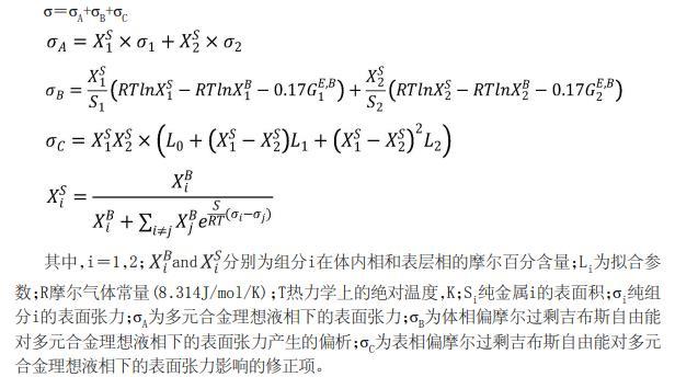 其中,i=1,2,3,……,n;and分別為組分i在體內(nèi)相和表層相的摩爾百分含量;R摩爾氣體常量(8.314J/mol/K);T熱力學(xué)上的絕對溫度,K;Si純金屬i的表面積;σi純組分i的表面張力;σA為多元合金理想液相下的表面張力;σB為體相偏摩爾過剩吉布斯自由能對多元合金理想液相下的表面張力產(chǎn)生的偏析;σC為表相偏摩爾過剩吉布斯自由能對多元合金理想液相下的表面張力影響的修正項。
