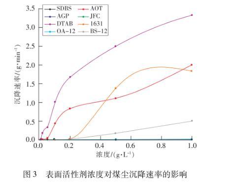 由表4和圖3可以看到,當(dāng)濃度為0.1 g/L時(shí),煤塵在AOT和APG溶液中的沉降時(shí)間不到1 min,而在陽離子和兩性型表面活性劑溶液中的沉降時(shí)間超過1 h。在同一濃度下,煤塵在不同表面活性劑溶液中的沉降時(shí)間相差較大,表面活性劑自身性質(zhì)影響潤濕煤塵的作用。當(dāng)濃度增大到各表面活性劑的臨界膠束濃度附近時(shí),煤塵在陰離子和非離子表面活性劑中的沉降時(shí)間會(huì)急劇下降,縮短至5 min之內(nèi),但在陽離子和兩性型表面活性劑中沉降時(shí)間依然大于1 h。總體而言,8種表面活性劑潤濕煤塵的能力由強(qiáng)到弱依次排序?yàn)椋篈PG>AOT>JFC>SDBS>OA-12>BS-12>1631>CTAB,這與表面活性劑降低表面張力的能力排序基本一致。陽離子表面活性劑潤濕煤塵效果最差,主要是因?yàn)橛H水頭基的正電荷與煤塵所帶負(fù)電荷之間的靜電力大于疏水基團(tuán)之間的范德華力,形成了親水基團(tuán)朝向煤塵表面、疏水基團(tuán)朝向水的單分子膜,不利于潤濕。APG潤濕煤塵效果最好主要與其自身結(jié)構(gòu)有關(guān),APG分子結(jié)構(gòu)碳原子上的醇羥基與水分子之間存在強(qiáng)烈相互作用,間接弱化了烷基糖苷分子結(jié)構(gòu)中親水基團(tuán)與煙煤表面含氧親水官能團(tuán)之間的吸附作用,更有利于疏水基團(tuán)與煤塵表面的疏水基團(tuán)發(fā)生強(qiáng)烈相互作用,以親水頭基伸向溶液,疏水尾部吸附在煤塵上的方式排列,降低了溶液及固-液界面張力,增加了煤塵親水性。APG濃度達(dá)到0.02 g/L時(shí),煤塵沉降時(shí)間僅為057 min,沉降速率為0.18 g/min,潤濕煤塵效果良好,當(dāng)濃度繼續(xù)增大,潤濕煤塵作用變化不大,綜合考慮成本及效率后,選擇濃度為0.02 g/L的APG作為低階煤用噴霧抑塵法的添加劑。