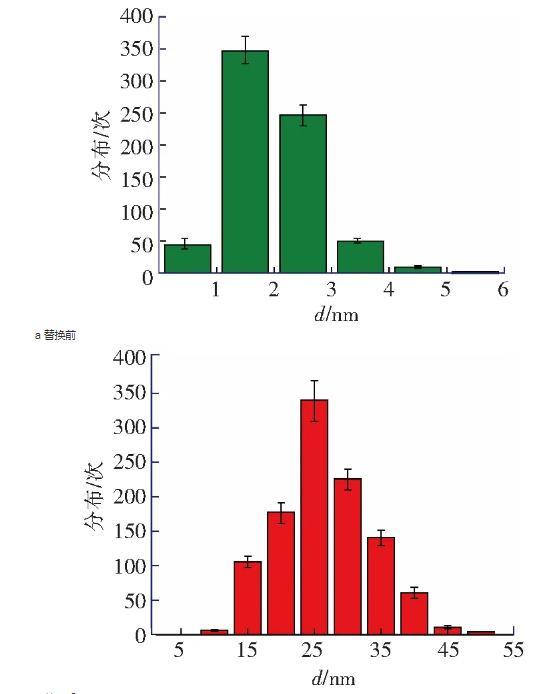 納米氣泡的高度在8~20 nm范圍之內(nèi),直徑在100~500 nm范圍之內(nèi),圖3c為圖3b中典型納米氣泡的截面圖。掃描得到納米氣泡圖像以后,在該表面上進行力曲線測量實驗,如圖2b所示。所有離曲線的‘跳進’距離均大于10 nm且是變化的,同時,由雙電層引起的斥力也消失了,不符合DLVO理論。這種‘跳進’距離不同的長程力應(yīng)該是因為醇-水替換后HOPG表面上生成的納米氣泡造成的。圖3b中納米氣泡的覆蓋率約為21.8%,在該表面不同位置測量得到的力曲線必然會存在探針-HOPG相互作用的情況,即不都是探針-氣泡的相互作用的情況。然而,根據(jù)醇-水替換前后多次測量力曲線得到“跳進”距離d的統(tǒng)計分析(圖4a和圖4b),醇-水替換前測量得到的力曲線的“跳進”距離大部分都小于5 nm(99%),而醇-水替換后測得的力曲線的“跳進”距離均大于10 nm。這表明,醇-水替換后即使不是探針-氣泡相互作用的情況下,探針與HOPG表面的相互作用時仍然存在長程引力,而這應(yīng)該是IGE造成的。該研究結(jié)果與Peng等人的研究結(jié)果一致,驗證了Limbeek對IGE與納米氣泡共存的假設(shè)。