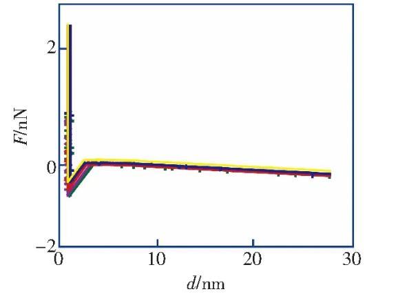 筆者利用原子力顯微鏡實驗測量了HOPG表面在醇-水替換前后的力距離曲線,發(fā)現(xiàn)醇-水替換前進針曲線的跳進距離小于5 nm,滿足DLVO理論;而在醇-水替換后納米氣泡覆蓋率為21.8%的情況下,進針曲線的跳進距離均大于10 nm,不能再用DLVO理論解釋,證明了IGE與納米氣泡共存這一現(xiàn)象。根據(jù)改進的Laplace-Young方程,結(jié)合文獻中對納米氣泡線張力值的計算結(jié)果,分析負的線張力對過渡區(qū)內(nèi)局部表面張力及局部固-液界面的影響,導(dǎo)致納米氣泡的接觸角反常小的原因之一。分析并討論雜質(zhì)對納米氣泡接觸角的影響,指出IGE與納米氣泡共存、線張力及雜質(zhì)影響的共同作用是導(dǎo)致納米氣泡接觸角“反常小”的原因。