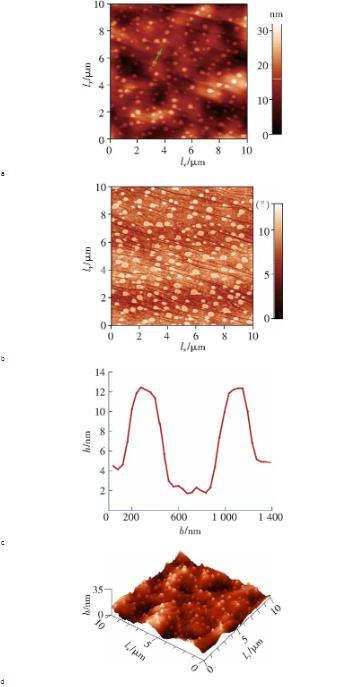 圖2a是探針在超純水中HOPG表面測得的力-位移曲線,當(dāng)分離距離大于5 nm時,針尖和表面之間的作用力主要為斥力。由于實驗中的水呈弱酸性(PH約5.6),而研究表明,HOPG表面在弱酸性水中帶弱負電荷,探針針尖(單晶硅)在水中也認為是帶弱負電荷。因此,這個斥力可以解釋為雙電層(Electrostatic double layer,EDL)引起的。當(dāng)分離距離小于5 nm時,在范德華力的作用下,針尖產(chǎn)生‘跳進’(jump in)現(xiàn)象并與HOPG表面接觸,整個力曲線符合DLVO理論。醇-水替換之后,在10 10掃描區(qū)域內(nèi)采用Taping-Mode模式(95%的set-point)以1 Hz的掃描頻率,如圖3a所示,HOPG表面上生成的納米氣泡呈球冠狀,相應(yīng)的三維圖如圖3d所示。