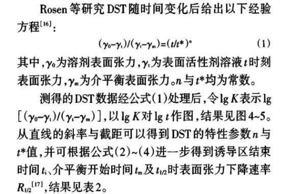 其中,γ0為溶劑表面張力,γt為表面活性劑溶液t時(shí)刻表面張力,γm為介平衡表面張力。n與t*均為常數(shù)。
