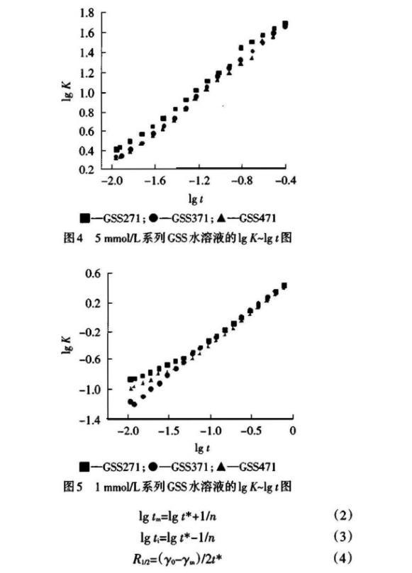 測(cè)得的DST數(shù)據(jù)經(jīng)公式(1)處理后,令lgK表示lg[(γ0-γt)/(γt-γm)],以lgK對(duì)lgt作圖,結(jié)果見(jiàn)圖4~5。從直線的斜率與截距可以得到DST的特性參數(shù)n與t*值,并可根據(jù)公式(2)~(4)進(jìn)一步得到誘導(dǎo)區(qū)結(jié)束時(shí)間ti、介平衡開(kāi)始時(shí)間tm及t1/2時(shí)表面張力下降速率R1/2,結(jié)果見(jiàn)表2。