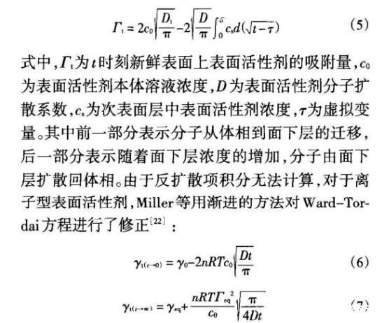 對(duì)c<cmc的表面活性劑溶液,Ward和Tordai根據(jù)擴(kuò)散控制機(jī)理提出了描述表面吸附動(dòng)力學(xué)的模型: