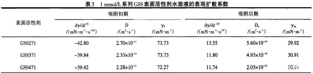 在吸附初期,GSS271的擴(kuò)散系數(shù)最大,表明較容易擴(kuò)散到次表面,這與在相同濃度下Rosen模型處理的n值最小吻合;在吸附后期,GSS471的擴(kuò)散系數(shù)最大,這與其柔性連接鏈扭曲變形而在表面定向排列緊密相關(guān),且與Rosen模型處理的t*值最大吻合。