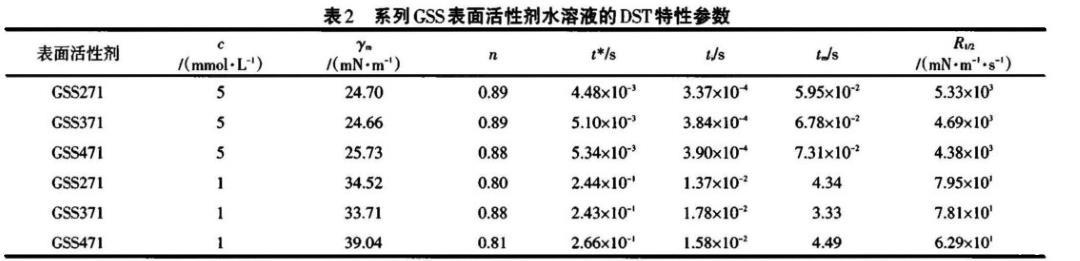 以GSS271為例,濃度越高,表面活性劑分子的擴(kuò)散推動(dòng)力越大,于氣液界面吸附越快,DST下降越顯著,因而誘導(dǎo)區(qū)結(jié)束的時(shí)間越早,越易達(dá)到介平衡,這與γm、ti、tm較小吻合;t*值隨濃度增大而減小,表明吸附后期勢(shì)壘隨濃度增大而增大,因?yàn)闈舛容^高時(shí),更多的GSS271分子吸附于表面,由于空間位阻、分子間靜電斥力的影響,阻礙了新的GSS271分子吸附,吸附勢(shì)壘變大。濃度高時(shí),R1/2大,動(dòng)態(tài)表面活性好。