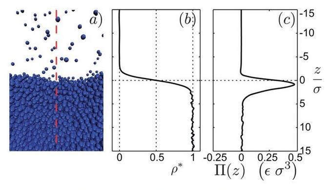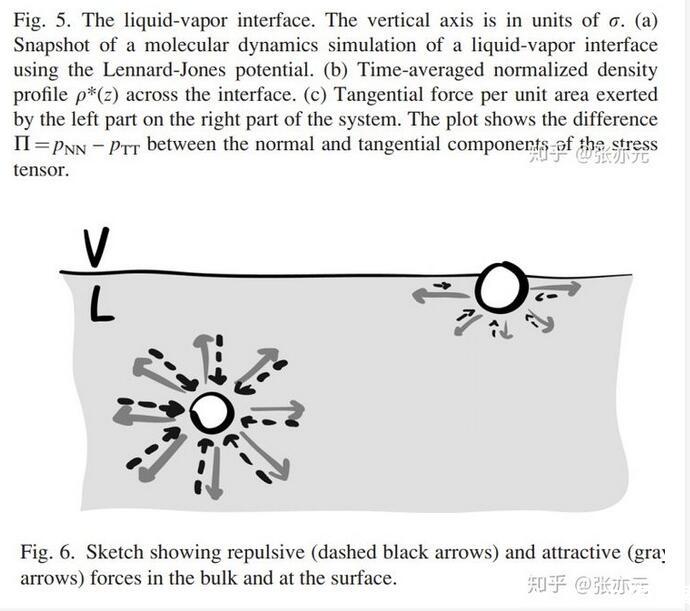 當(dāng)分子間距較小時(shí),斥力為主,分子間距較大時(shí),引力為主。在斥力與引力平衡時(shí),Lennard-Jones勢(shì)能最小。現(xiàn)在,我們就可以來詳細(xì)地考慮液-氣界面了。圖5a是通過分子動(dòng)力學(xué)仿真得出的液-氣界面照片,對(duì)應(yīng)的時(shí)間平均密度分布圖是圖5b。從高密度的液體到低密度的氣體發(fā)生在一個(gè)幾個(gè)分子厚度的窄區(qū)域。為了確定毛細(xì)力,我們沿垂直界面方向?qū)⑾到y(tǒng)分為兩個(gè)子系統(tǒng)(圖5a)。考慮左邊子系統(tǒng)對(duì)右邊子系統(tǒng)的單位面積的作用力,即應(yīng)力,在豎直方向上的分布。這個(gè)力有兩個(gè)來源:壓力P和額外壓力Π(圖5c)。圖5c表明有個(gè)力局部存在于界面附近,其實(shí)這個(gè)力就是表面張力,且這個(gè)力范圍和密度突變的范圍很相似。這說明表面張力的確是一個(gè)真實(shí)的力,而不僅僅是表面能的一種純數(shù)學(xué)描述。既然我們發(fā)現(xiàn)在界面附近的確局部存在一個(gè)平行的力,那我們回到問題1,為什么表面張力平行于界面而不是垂直于界面?我們注意到圖1僅僅描繪了分子間引力作用。更全面的圖應(yīng)該如圖6所示,包含了引力與斥力作用。在遠(yuǎn)離界面的液體本體內(nèi),由于液體分子周圍的完全對(duì)稱性,分子的受力完全平衡。但是,靠近界面附近的地方,上下對(duì)稱性被打破。為修復(fù)豎直方向的力平衡,向上的斥力需平衡向下的引力。而在平行于界面的方向,對(duì)稱性仍然存在,平行于界面方向的力平衡仍然存在。這就可以存在一種情況,引力作用的強(qiáng)度與斥力作用的強(qiáng)度不同。實(shí)際上,在界面附近的水平方向上,引力作用比斥力更強(qiáng),這產(chǎn)生了表面張力。