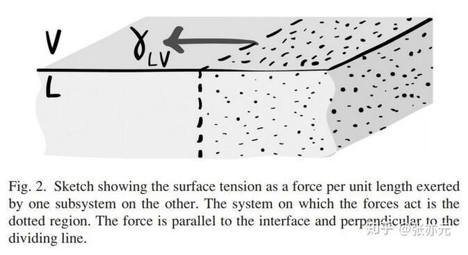 熱動(dòng)力學(xué)觀點(diǎn)和力學(xué)觀點(diǎn)可以用虛功原理聯(lián)系起來。圖1中的界面處的分子明顯受到一個(gè)垂直于界面方向的力,但圖2中的力明顯平行于界面,那么第1個(gè)關(guān)鍵問題就是:為什么表面張力是一個(gè)平行于界面的力,即使它似乎一定垂直于界面?