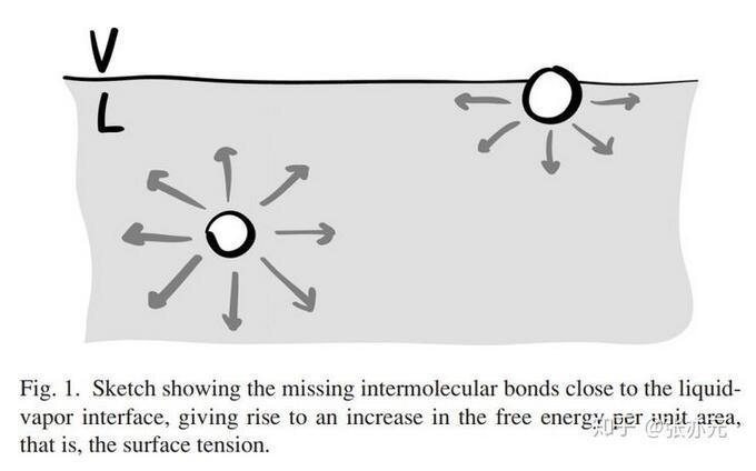 借鑒Gibbs的開創(chuàng)性工作,我們可以將表面張力理解成因兩本體相間界面存在導(dǎo)致的額外表面能。液-氣界面附近的液體分子所處的環(huán)境與本體中的分子不同,這種差異經(jīng)常被人用圖1的示意圖表現(xiàn),即近乎一半的分子間引力缺失,這導(dǎo)致自由能的增加,這是熱動(dòng)力學(xué)的觀點(diǎn)。