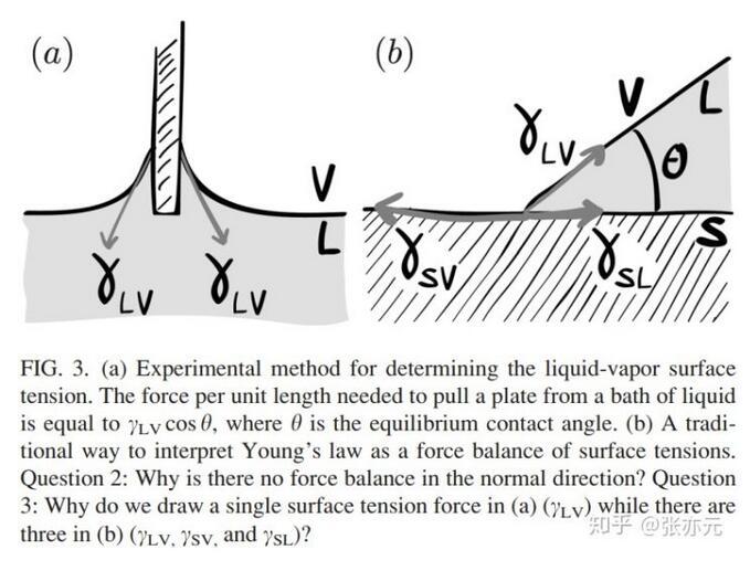 測(cè)量液-氣表面張力的標(biāo)準(zhǔn)方法是測(cè)量將金屬板拉出水面的力,這個(gè)力與表面張力γLV相關(guān)(圖3a)。而對(duì)楊氏方程(圖3b),一般認(rèn)為在接觸線處存在三個(gè)界面張力在固-液界面方向的力平衡γSL+γLVcosθ=γSV。初學(xué)者在此處會(huì)有以下困惑: