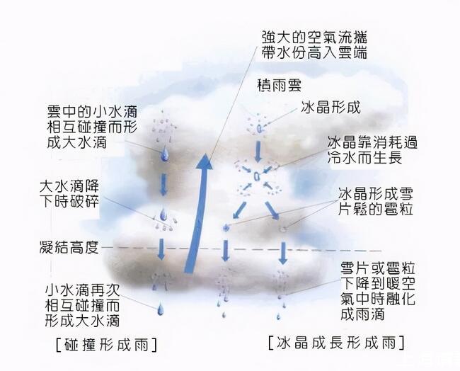 3.當(dāng)小水滴數(shù)量足夠多的時(shí)候就聚積組成了云,小水滴在云里來回地相互碰撞,有些小水滴會(huì)溶合成體積更大的大水滴,然而大體積的水滴此時(shí)的質(zhì)量是大于空氣質(zhì)量的,此時(shí)空氣是沒有力量能夠把水滴停留在大氣中,因此水滴會(huì)在萬有引力的作用下掙脫云的束縛從天而降,降下來的水就是「雨」了。