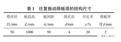 實驗是在內徑50 mm、有效高度1500 mm的往復篩板塔中進行,實驗設備流程圖見圖1。塔身為玻璃材質,塔頂和塔底有沉降段,篩板在塔頂?shù)恼{速直流電機通過曲軸帶動篩板產(chǎn)生上下往復振動,振幅固定25 mm,振動頻率0~1.4 Hz。篩板材質為不銹鋼,不同于Karr振動篩板塔的大孔徑和高開孔率,本實驗采用的篩板孔徑和開孔率相對較小,振動萃取段為1000 mm。萃取塔的具體結構參數(shù)見表1。