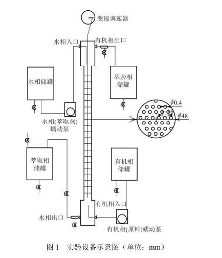 水相和有機相分別通過可調節(jié)流速的蠕動泵進入塔內,兩相在塔內實現(xiàn)逆流接觸傳質后分別從塔底和塔頂?shù)某隹诹鞒鲞M入各自儲罐。實驗中溶質丁二酸從有機相向水相傳遞,有機相和水相分別作分散相,以此來考察溶質從分散相到連續(xù)相(d→c)和從連續(xù)相到分散相(c→d)不同傳質方向對萃取效果的影響。