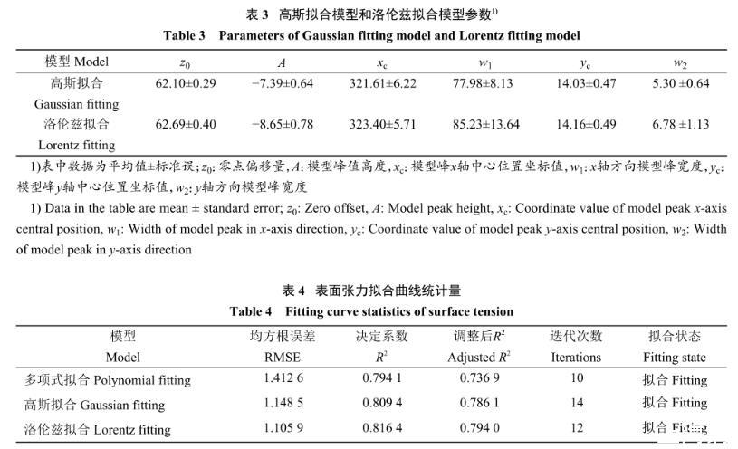 多項(xiàng)式擬合模型的參數(shù)(平均值±標(biāo)準(zhǔn)誤)如下所示:z0=116.16±43.94,A1=?0.23±0.10,A2=0.002±0.001,A3=(?1.19±0.45)×10?5,A4=(2.25±0.88)×10?8,A5=(?1.91±0.64)×10?11,B1=?19.950 0±19.724 9,B2=3.22±3.21,B3=?0.24±0.24,B4=0.009±0.008,B5=(?1.22±1.30)×10?4。表3為高斯擬合模型和洛倫茲擬合模型參數(shù),表4為溶液表面張力3種擬合曲線的統(tǒng)計(jì)量。由表4可以看出,3種擬合方式的決定系數(shù)(R2)均大于0.79,調(diào)整后R2(Adjusted R2)均大于0.73,這說(shuō)明擬合函數(shù)有意義,且均方根誤差(Root mean square error,RMSE)都小于1.5。3種擬合模型均能夠描述磁場(chǎng)強(qiáng)度和磁化時(shí)長(zhǎng)對(duì)除草劑溶液表面張力的影響,但相比較于其他2種擬合方式,洛倫茲擬合R2為0.816 4,調(diào)整后R2為0.794 0,兩者均大于其他2種擬合方式,R2與調(diào)整后R2越大,說(shuō)明擬合效果越好;RMSE為1.105 9,均小于其他2種擬合方式,RMSE越小,說(shuō)明預(yù)測(cè)模型描述試驗(yàn)數(shù)據(jù)越精確。