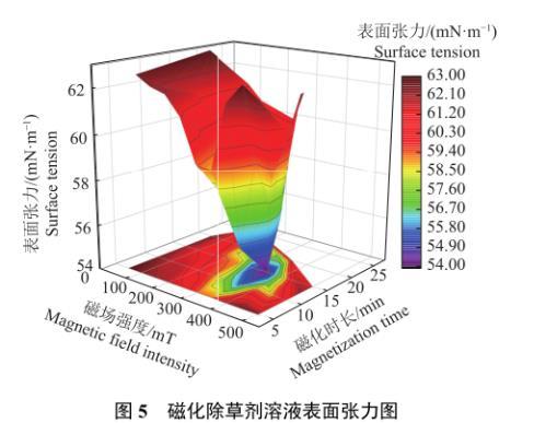 為了直觀地分析磁場(chǎng)強(qiáng)度和磁化時(shí)長(zhǎng)2個(gè)因素共同作用對(duì)除草劑溶液表面張力的影響規(guī)律,建立以磁場(chǎng)強(qiáng)度和磁化時(shí)長(zhǎng)為自變量、以溶液表面張力為因變量的二元函數(shù),使用OriginPro 2018繪制磁場(chǎng)強(qiáng)度和磁化時(shí)長(zhǎng)對(duì)表面張力影響規(guī)律的空間曲面分布圖(圖5)。由圖5可以看出,磁場(chǎng)強(qiáng)度和磁化時(shí)長(zhǎng)對(duì)溶液表面張力影響規(guī)律的空間曲面分布圖呈峰值為負(fù)值的高斯空間分布規(guī)律,即空心圓錐面分布,這說(shuō)明并不是磁場(chǎng)強(qiáng)度越大或者磁化時(shí)間越長(zhǎng),除草劑溶液的表面張力就越小,而是存在處理效果最佳的磁場(chǎng)強(qiáng)度和磁化時(shí)長(zhǎng)。磁化除草劑溶液表面張力試驗(yàn)結(jié)果見(jiàn)表2。當(dāng)磁場(chǎng)強(qiáng)度為350 mT、磁化時(shí)長(zhǎng)為15.0 min時(shí),除草劑溶液表面張力值最小,為54.0 mN/m,下降14.96%,磁化效果最佳。