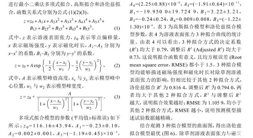 為了進(jìn)一步分析并預(yù)測(cè)試驗(yàn)中未涉及到的磁場(chǎng)強(qiáng)度和磁化時(shí)長(zhǎng)對(duì)除草劑溶液表面張力的影響,以及給出符合描述表面張力隨磁場(chǎng)強(qiáng)度和磁化時(shí)長(zhǎng)變化的函數(shù)關(guān)系,使用OriginPro 2018非線性曲面擬合功能分別對(duì)磁化除草劑溶液表面張力數(shù)據(jù)進(jìn)行最小二乘法多項(xiàng)式擬合、高斯擬合和洛倫茲擬合,函數(shù)關(guān)系式分別為公式(1)(2)(3)。