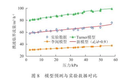(3)液滴尺寸和變形對攜液臨界流量影響較大。當液滴特別小時,液滴在壓差下基本不發(fā)生形變,液滴基本呈球形,曳力系數近似0.44;隨著液滴直徑越大,液滴越容易變形,液滴高寬比越小,曳力系數越大,攜液臨界流速變小。考慮了液滴尺寸和液滴變形影響的新模型與實驗數據吻合良好。