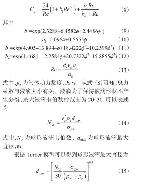 式中,φ為液滴變形程度系數,為與變形液滴體積相等的等效球形表面積與實際液滴表面積的比值。當氣液相對速度不大時,液滴保持球形,可以利用球形液滴曳力系數計算攜液臨界流量,但是當液滴發(fā)生變形以后,曳力系數和液滴迎風面積相應的發(fā)生改變,用球形液滴曳力系數計算誤差可能高達30%,對于非球形剛性顆粒,可以應用如下曳力系數表達式進行計算: