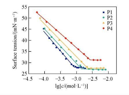 為研究4種非離子Gemini表面活性劑的表面活性,采用液滴體積法測定了不同濃度下的表面張力。圖2示出P1,P2,P3和P4的溶液表面張力與濃度對數(shù)的關(guān)系。溶液的表面張力隨濃度的增加而降低,當(dāng)溶液的濃度高于cmc后,表面張力達到最低值并基本趨于穩(wěn)定。這是由于隨著表面活性劑濃度的升高,在氣/液界面上吸附的表面活性劑分子數(shù)量增多,界面上的分子排列越來越緊密,表面張力持續(xù)下降;當(dāng)表面活性劑濃度達到cmc后,溶液內(nèi)部的分子開始聚集形成膠束聚集體,表面活性劑分子在界面上達到飽和吸附,因此cmc之后表面張力趨于穩(wěn)定。