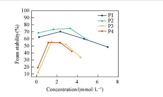 圖6示出4種表面活性劑泡沫穩(wěn)定性隨濃度的變化情況。泡沫穩(wěn)定性隨著濃度的增加先升高至最大值后又降低。這是因?yàn)楸砻婊钚詣┑奈綄?dǎo)致了Gibbs-Marangoni效應(yīng)。當(dāng)液膜受到?jīng)_擊局部變薄時(shí),產(chǎn)生表面張力梯度,導(dǎo)致鄰近區(qū)域吸附的表面活性劑攜帶水化層向薄膜處遷移,以恢復(fù)原來(lái)的表面張力并修復(fù)液膜。在較低濃度時(shí),表面活性劑濃度的增加使得Gibbs-Marangoni效應(yīng)隨之加強(qiáng),進(jìn)而有效阻止液膜變薄,增加泡沫的穩(wěn)定性。當(dāng)濃度大于cmc后,溶液中的表面活性劑分子能夠快速吸附在界面處,使得Gibbs-Marangoni效應(yīng)減弱,泡沫穩(wěn)定性降低。在4種表面活性劑中,P2的泡沫穩(wěn)定性最強(qiáng),這可能是由于分子在空氣/水界面上排列最緊密,形成的液膜強(qiáng)度更大,因此泡沫不易發(fā)生破裂。
